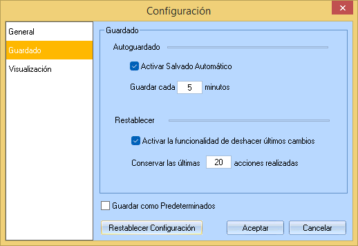 un salvado automático cada X tiempo (por defecto viene definido para guardar