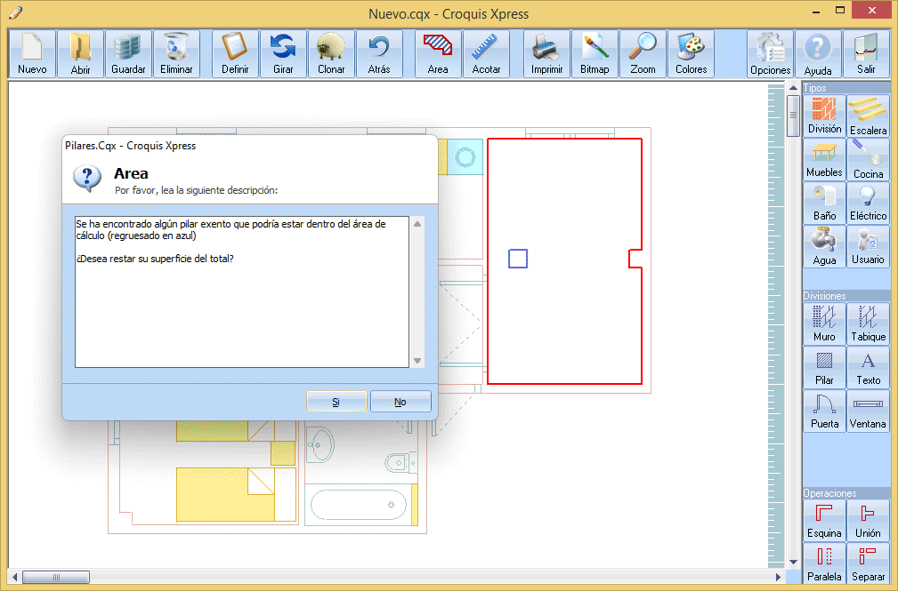 Superficies: Simplemente pulsamos el Area luego pinchamos en una zona vacía del salón. Si el programa detecta una estancia cerrada, nos trazará una línea línea poligonal cerrada en color rojo alrededor de todo el perímetro. En el caso que nos ocupa, además detecta un pilar exento dentro de ese área y nos pregunta si queremos restar su superficie de la superficie total del solar. Le decimos que sí y nos pregunta si queremos agregar una anotación en el dibujo con la superficie calculada. Aceptamos y veremos como se agrega la superficie.