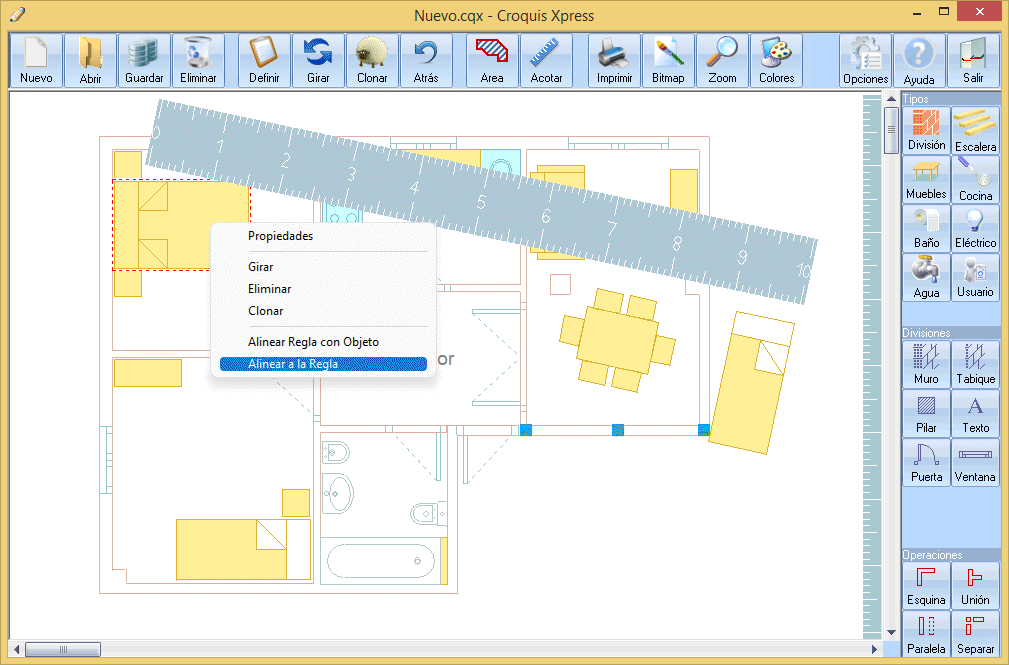 Consiste en usar la regla como un transportador de ángulos, seleccionando el objeto origen (puede ser de cualquier tipo) y con el botón derecho abrir el Menú Contextual para seleccionar la opción Alinear Regla con Objeto. Veremos como la regla cambia de posición para coger el mismo ángulo del objeto.