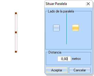 El siguiente muro que pondremos será paralelo al muro de la izquierda, para lo que simplemente pulsaremos en el apartado de relaciones el botón de Paralela, y luego uno de los puntos de arrastre de nuestra primera pared. Nos propone una paralela por la derecha (el indicador iluminado está a la derecha en el formulario emergente) y a un metro de separación. Como realmente la paralela que quiero se encuentra a 8,80 metros en mi medición introduzco esta medida en la casilla y pulso “Aplicar”. Ya tenemos la Pared 3