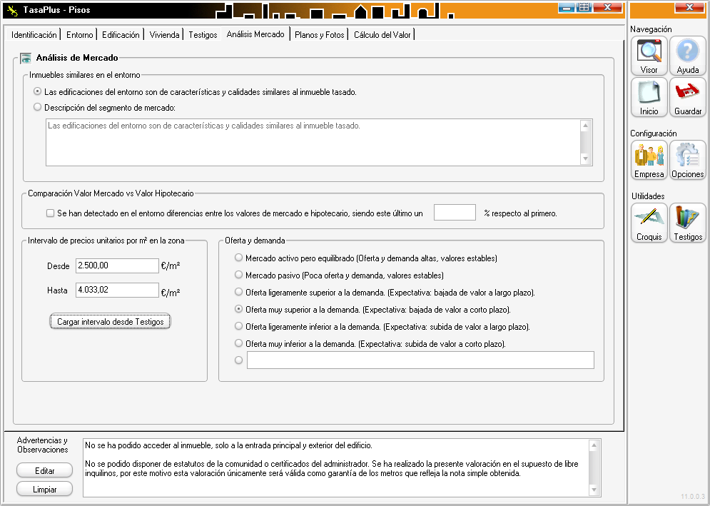 Para indicar el intervalo de precios del mercado podemos escribirlo manualmente o que el programa extraiga los valores unitarios mínimo y máximo de la lista de testigos asociados pulsando el botón que aparece bajo las casillas.