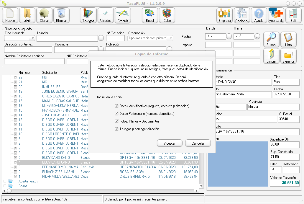 Dependiendo del caso nos interesará copiar el informe entero excepto los testigos que queremos sustituir por unos más recientes (mismo inmueble, mismo propietario pero diferente momento en el tiempo), o al contrario, dos pisos en el mismo edificio pero de propietarios diferentes. Nos vale la descripción del edificio y los testigos, pero el propietario es diferente. Son solo un par de ejemplos que explican por qué antes de copiar nos pregunta qué datos queremos que se copien y cuales no.