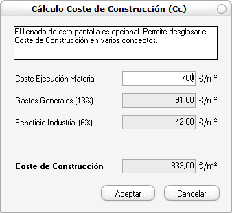 Desde la solapa de cálculos, si estamos averiguando el precio unitario para el método de Reposición, tenemos una casilla para anotar el coste de construcción por m² edificado.