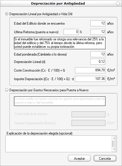 Desde la solapa de cálculos, si estamos averiguando el precio unitario para el método de Reposición, tenemos una casilla para calcular la depreciación por antigüedad. Sin embargo no hemos de escribir nada directamente, sino pulsar el botón con la calculadora que hay antes de la casilla y se nos mostrará la siguiente pantalla, en la que hemos de elegir una de las dos formas propuestas de depreciación: