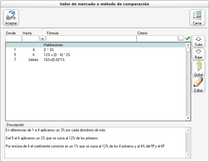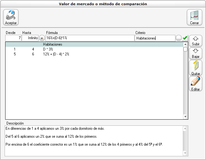 Cada línea indica qué fórmula utilizar en función del tramo de diferencia. Esto significa que no valoramos por igual una diferencia de 2 dormitorios que una diferencia de 5 (de hecho con una diferencia tan grande deberíamos preguntarnos si ambas viviendas son realmente homogeneizables o son tan distintas que el testigo no sirve como muestra).