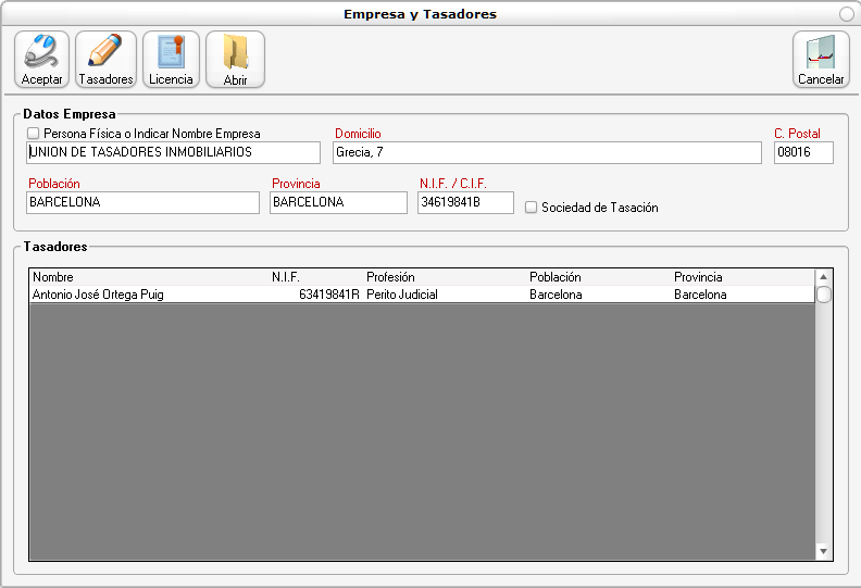 Si el programa no ha sido aún configurado esta pantalla funcionará como un asistente, mostrando previamente la pantalla de Licencia para introducir la clave de activación, luego los datos de empresa y por último la ficha de un tasador.