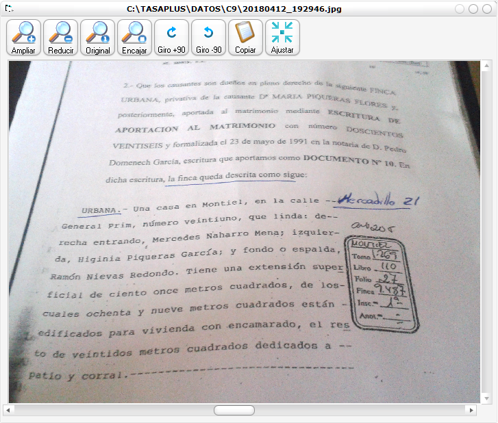 Para planos y documentos solo se realiza una copia, sin reducción, ya que pueden contener líneas finas o texto que al reducirse se pierda. En todo caso debería ser el propio usuario si estima que las imágenes tienen más resolución de la necesaria, el que la ajuste de forma visual, comprobando que sigan siendo legibles. Para facilitar la tarea TasaPLUS avisa cuando detecta una imagen más grande de lo habitual.