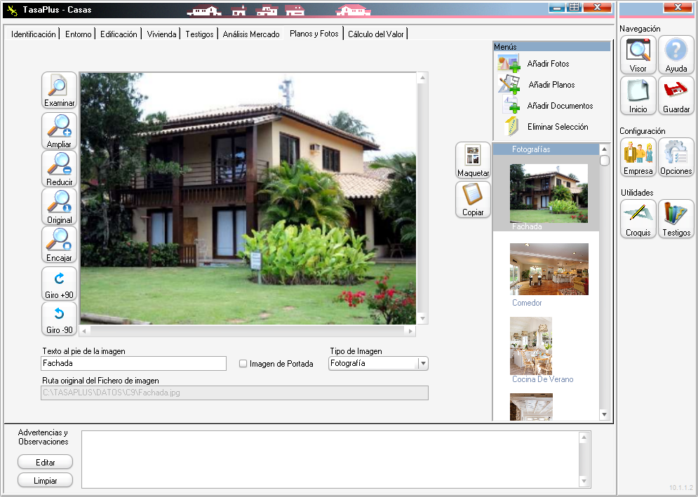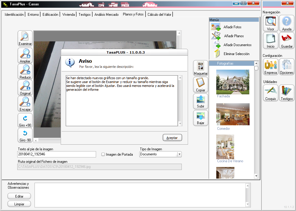 TasaPLUS no tiene ninguna plantilla previa que nos limite el número de fotografías o planos que queramos incluir en el informe, sino una lista abierta, a la que podemos agregar tantas fotos como queramos, asignar a cada una un nombre aclaratorio (si no nos convence el nombre del fichero, que se coge por defecto), y previsualizarlas en una columna.