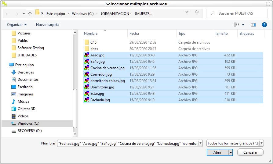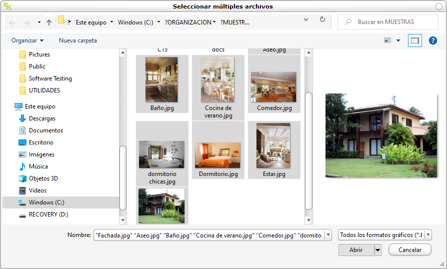 Podemos agregar múltiples imágenes simultáneamente, ya que la pantalla de búsqueda de archivos nos permite elegir varias con la tecla control pulsada. Abajo vemos dos modos de selección, ya que podemos optar entre ver solo la lista de ficheros o una previsualización.
