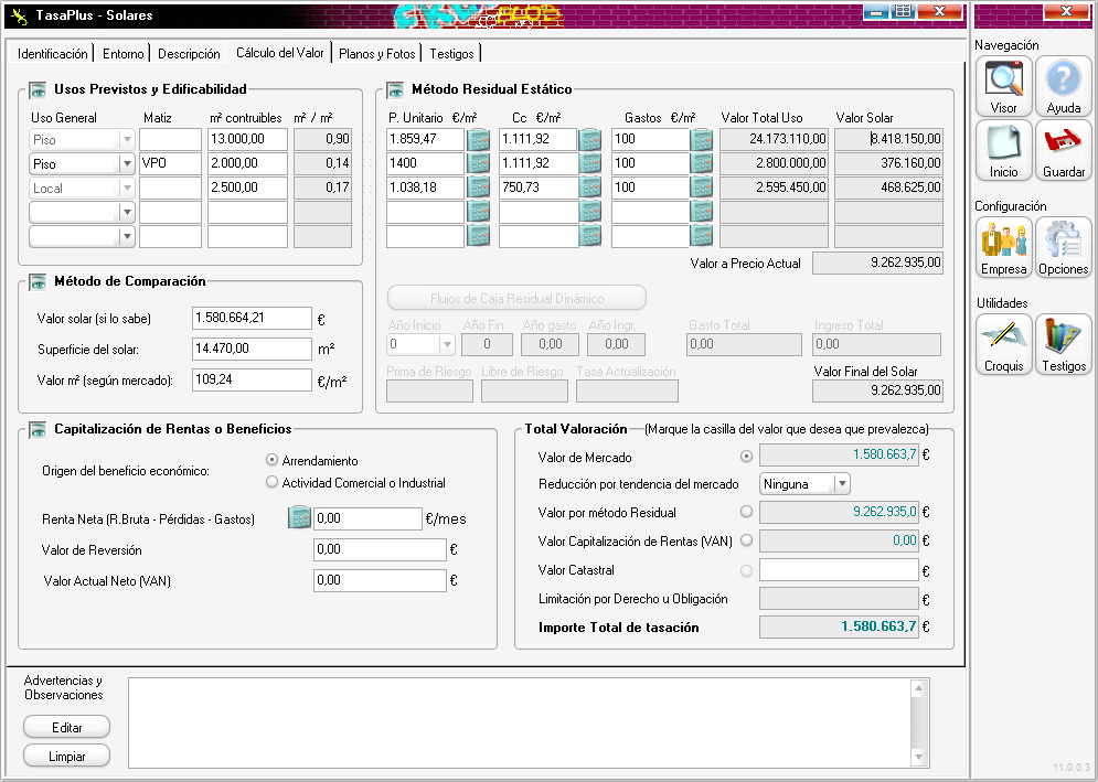 La suma de todos los valores parciales por uso nos dará el total del valor del solar, que se anota en la casilla correspondiente en el apartado "Total Valoración".