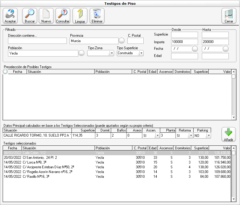 Para seleccionar los testigos de cada uso tenemos una pantalla similar a la solapa de testigos del formulario de ese mismo tipo de inmueble (arriba para filtrar, una primera lista para revisar y marcar los que nos interesen de entre todos los resultados filtrados y una segunda a la que agregamos los testigos seleccionados con el botón "Aņadir"). La principal diferencia estriba en que, mientras en la comparación de por ejemplo un piso como principal, sabemos el número de dormitorios que tiene, aquí estamos suponiendo un posible inmueble. El programa nos propone unos valores posibles (entre ambas listas), en base a los valores medios de los testigos que hemos seleccionado, pero también podemos modificarlo (si por ejemplo ponemos pisos sin ascensor, el supuesto principal tampoco tendría ascensor, pero si nosotros le decimos que sí prevalece nuestra elección y se aplicará la homogeneización en base a la misma). Una vez tengamos los testigos, pulsamos el botón "Aceptar" y se abrirá la pantalla normal de homogeneización.
