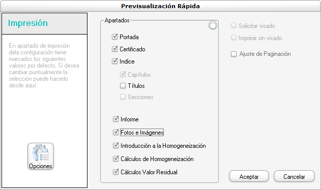 Tenemos dos botones con impresora, uno que pone "Rápida" y otro que pone "Final". Hacen referencia a que uno hace una previsualización rápida del informe, en tanto que el otro analiza cada página para comprobar que no quede un título justo en la última línea o que la firma no quede aislada o cortada en la última página. En ambos casos se nos pregunta qué apartados queremos incluir, pero mientras en la previsualización rápida solo vemos un check de ajuste de paginación desmarcado: