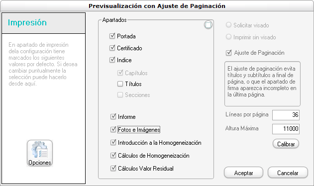 en la previsualización final vemos la misma lista de apartados a imprimir, pero esta vez acompañados del check marcado y unas casillas de valor para indicar el número aproximado de líneas por página y la altura de la página (en una medida basada en puntos máximos por pantalla). No hemos de saber dichos parámetros, ya que vienen predeterminados para la fuente Arial y se pueden calibrar automáticamente para otras fuentes mediante el botón que encontramos debajo.En la lista la Homogeneización de testigos solo aparece si hemos realizado previamente el cálculo.
